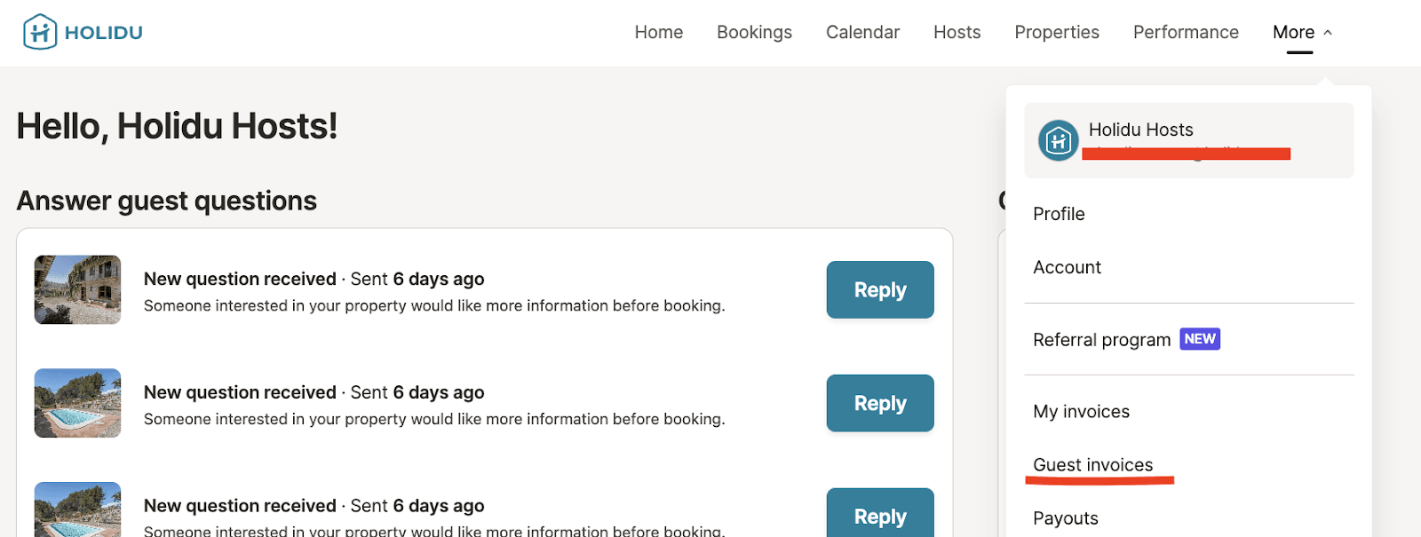 - Log into your Holidu account. If you manage multiple properties, select the one associated with the booking.