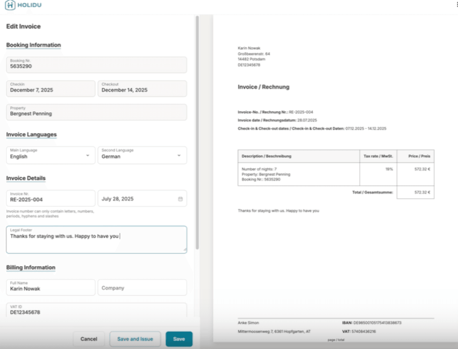 - Holidu’s commission is deducted before payout, but must still appear in the total amount.