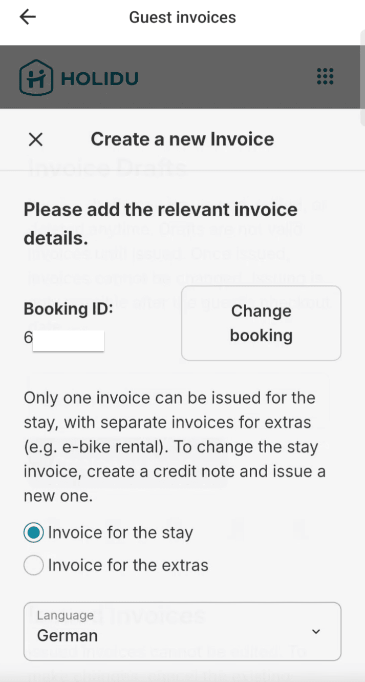 To make things easier, Holidu provides the Guest Invoice Tool, available in your host account. This tool allows hosts to easily create legally compliant invoices directly through their Holidu account.
