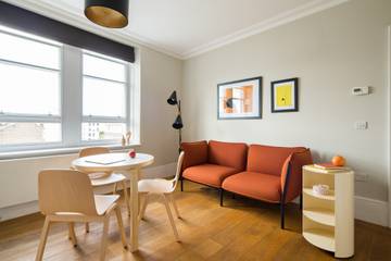 • Bedroom: Spacious double bedroom with king-size bed, wardrobe, desk, and wall-mounted TV. • Lounge: Comfortable living area with sofa bed and Smart TV with Media Hub. • Kitchen: Fully fitted with oven, washing machine, dishwasher, Nespresso coffee machine, toaster, and kettle. • Bathroom: Contemporary design with walk-in shower and complimentary toiletries. • Dining: Open-plan layout with space for relaxed dining and entertaining. • Size: 45.5 SQ M / 490 SQ FT. Ideal for up to four guests. Additional Features • High-speed Wi-Fi • Fresh bedding and towels provided • Complimentary welcome p...